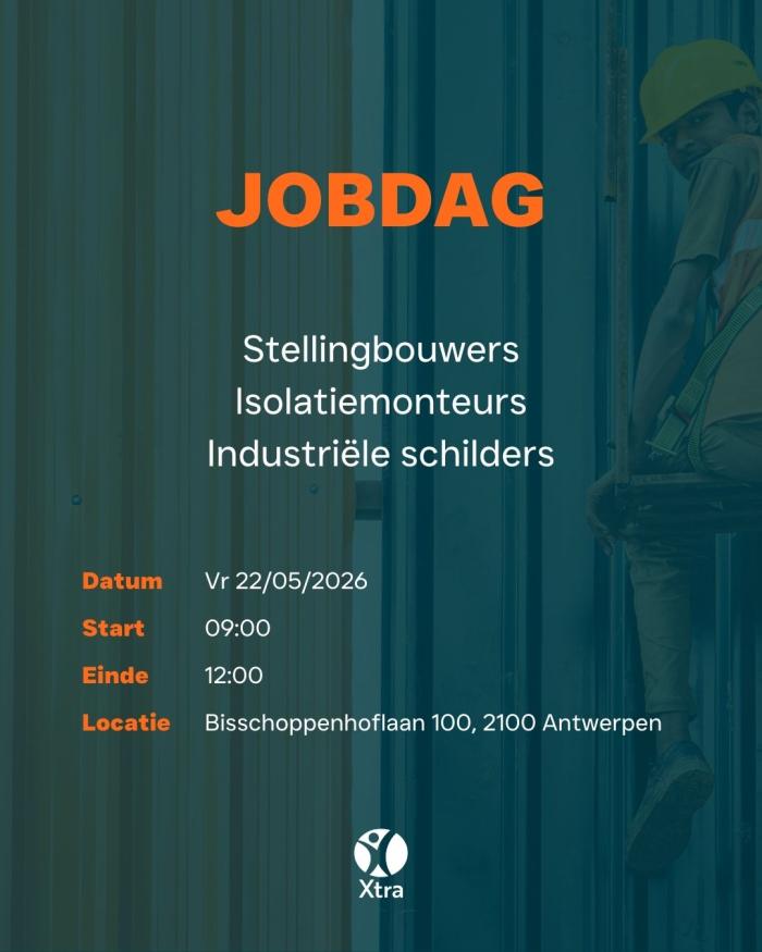 Агенція тимчасового найму Xtra організовує цільовий день вакансій для кандидатів, які шукають роботу промисловим малярем, монтажником ізоляції або монтажником риштування на нафтохімічних об'єктах. Під час цього дня вакансій проводитимуться короткі, структуровані співбесіди з кандидатами, щоб оцінити їхній досвід, мотивацію та доступність. Після цього кандидати заповнюють анкету, щоб їхній профіль був повністю та правильно зареєстрований. Цей ярмарок вакансій призначений для промислових малярів, монтажників риштувань та монтажників ізоляції. Досвід є перевагою, але мотивація має не менш важливе значення.