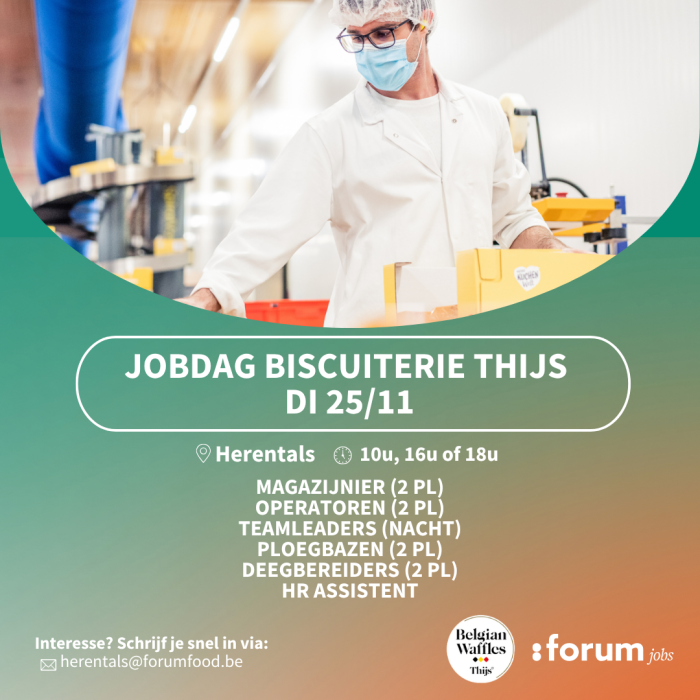 Завітайте на ярмарок вакансій у Biscuiterie Thijs (вирорбництво бельгійских вафель) та відкрийте для себе наступний крок у кар'єрі. Ярмарок організовано агенцією тимчасвого найму Forum jobs. Розшукуються кандидати на різні посади: складський працівник, оператор, керівник групи, бригадир, тістогон та помічник з персоналу.