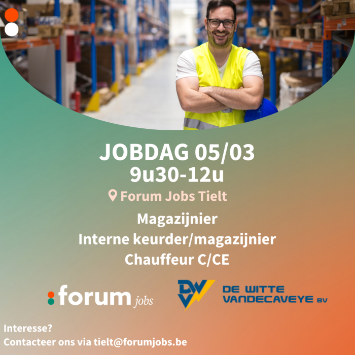 Агенція тимчасвого найму Forum Jobs організовує ексклюзивний ярмарок вакансій для компанії De Witte - Vandecaveye. Запрошуються мотивовані кандидати на посади складського робітника, внутрішнього інспектора та водія C/CE.